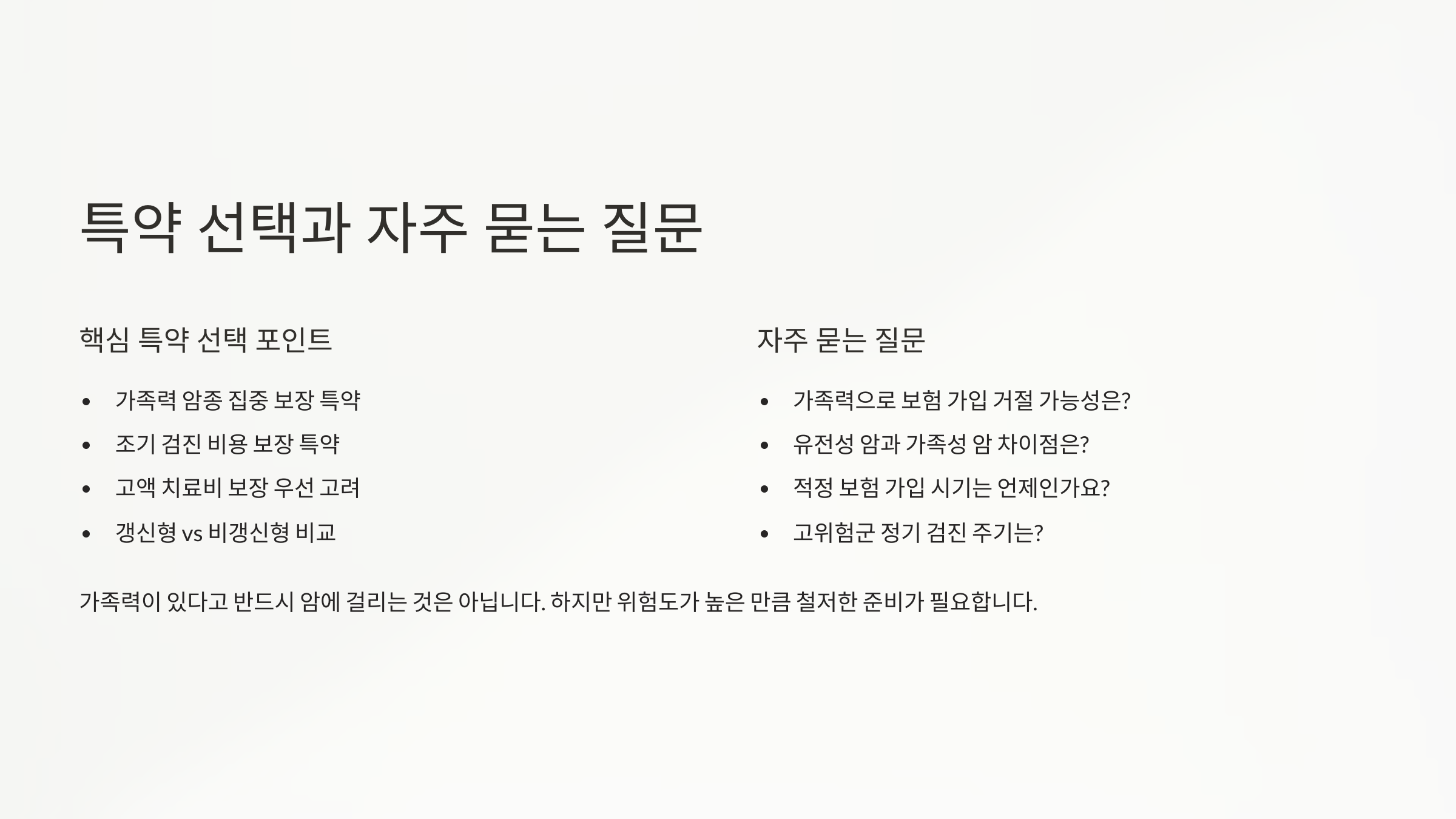실제로 제가 생각했을 때, 가족력이 있는 경우에는 단순한 암 진단비만 보장되는 상품보다는 고액 치료비나 재발 보장까지 가능한 상품이 더 실질적인 도움이 돼요. 선택할 때 핵심 포인트를 알려드릴게요! 📌