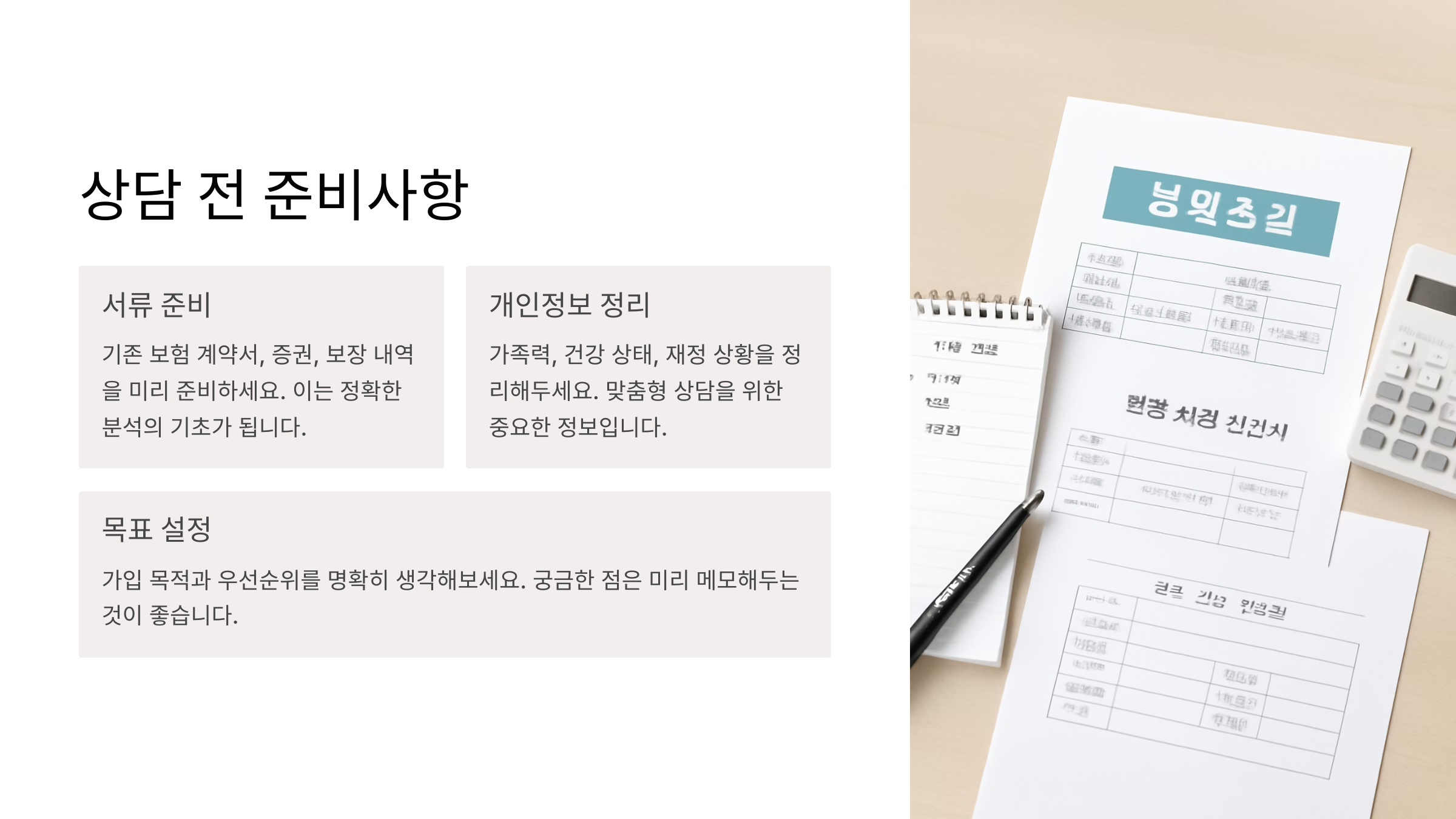 보험컨설팅을 받기 전, 미리 준비하면 상담이 훨씬 수월하고 정확해져요. 아무런 준비 없이 상담을 받으면 중요한 정보가 빠져서 잘못된 설계가 나올 수도 있답니다. 그래서 사전에 몇 가지를 체크해두는 게 좋아요.