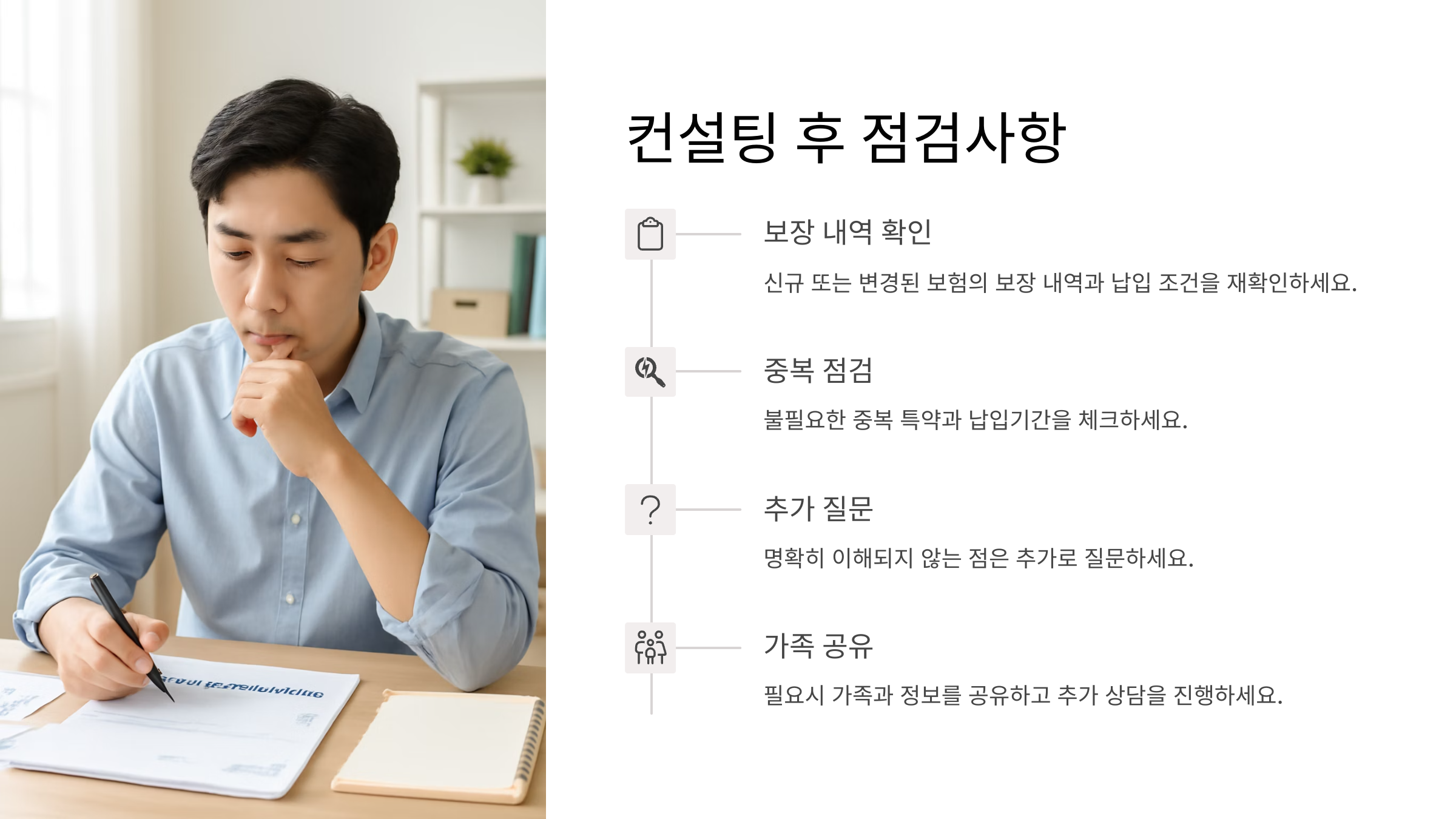 컨설팅 후 점검 사항 중 가장 중요한 건, '내가 이해한 대로 잘 반영됐는가?'예요. 보험은 매우 긴 기간 동안 유지되는 상품이라, 처음에 잘못 가입하면 나중에 불이익을 받을 수 있어요. 그래서 확인, 또 확인이 정말 중요해요.