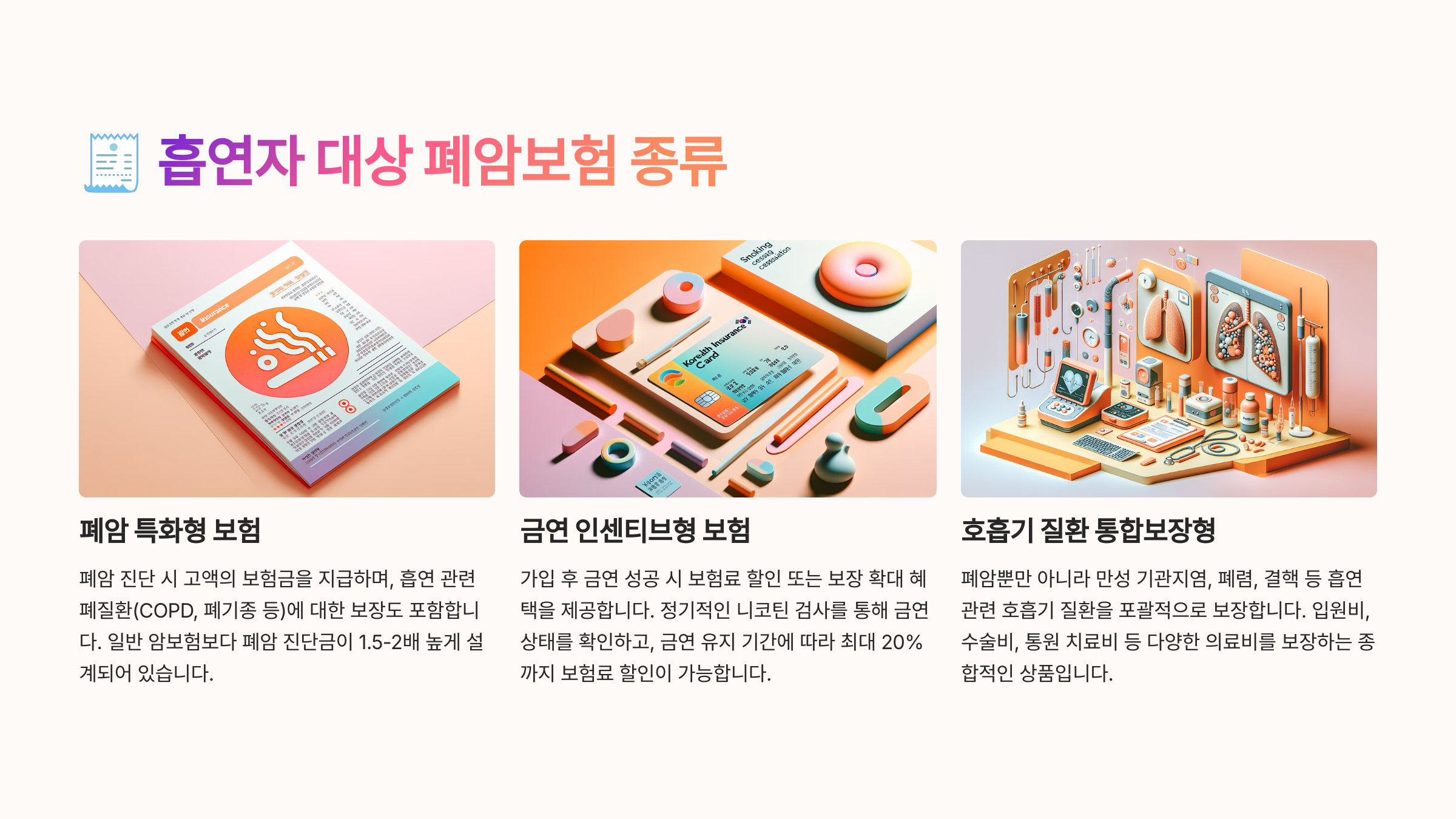 또한, 일부 흡연자 전용 보험은 ‘폐 관련 질환 집중 보장’ 특약이 강화되어 있어서, 단순 폐암 외에도 만성 폐쇄성 폐질환(COPD), 폐렴, 기관지염 등 다양한 호흡기 질환까지 폭넓게 커버돼요.
