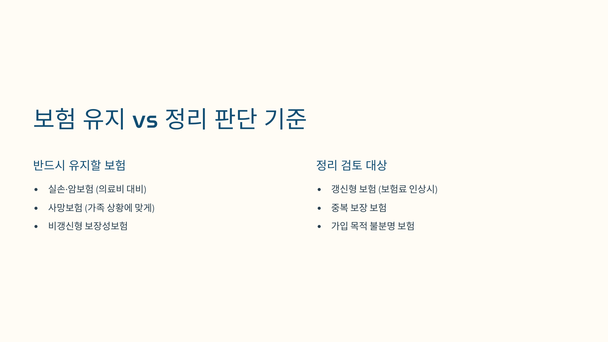 그렇다고 무작정 해지하는 건 위험해요. 보장이 필요한 보험은 유지하고, 중복되거나 목적이 불분명한 보험부터 정리하는 게 좋아요. 내가 생각했을 때, 이 판단 기준을 먼저 세우는 게 핵심이에요. 🧠