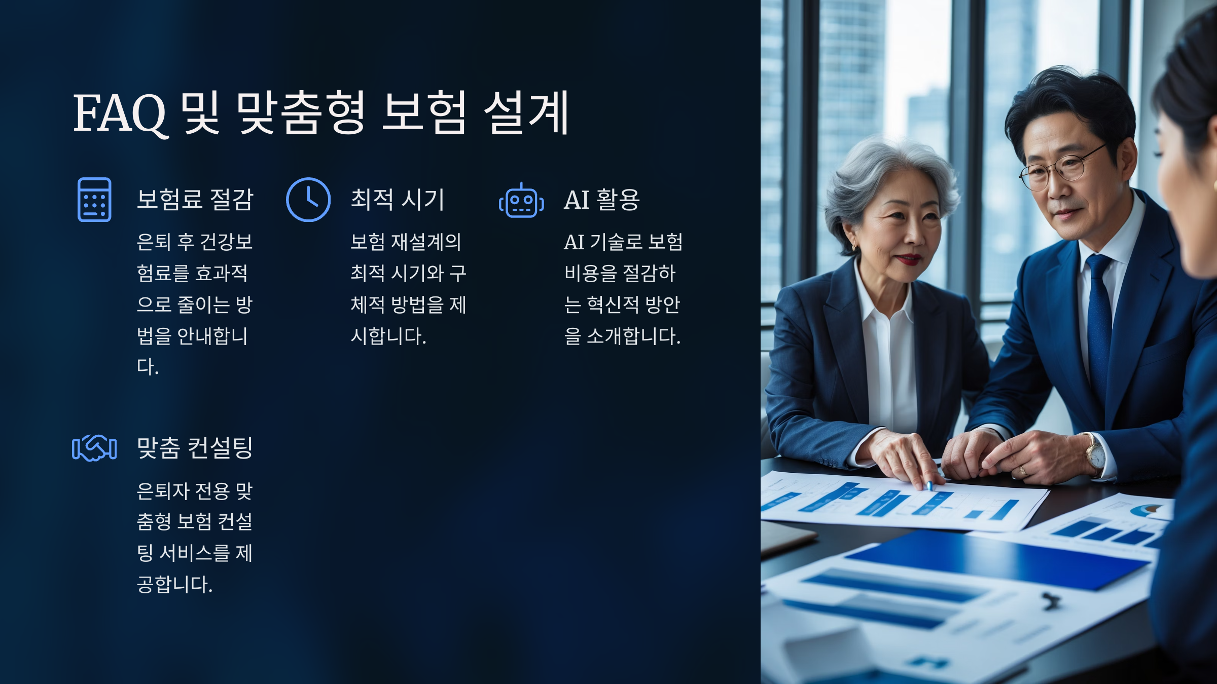 특히 정년을 앞두고 있거나, 자녀 교육비 지출이 끝나는 시점에는 보험료 부담을 줄이면서도 보장을 강화할 수 있는 최적의 타이밍이에요. 불필요한 특약은 정리하고, 꼭 필요한 보장만 남기는 ‘보험 다이어트’가 필요하죠.